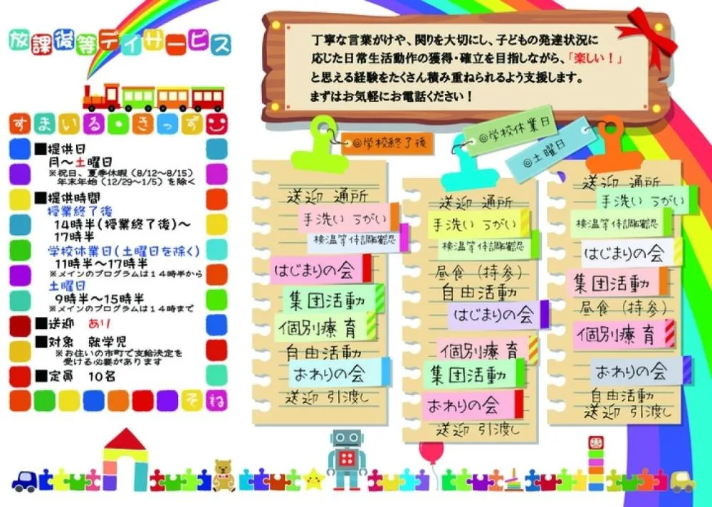 放課後等デイサービス ・月曜日~金曜日 14:30~17:30 ※学校休業日及び長期休暇期間は11:30~17:30 土曜日 9:30~15:30 |